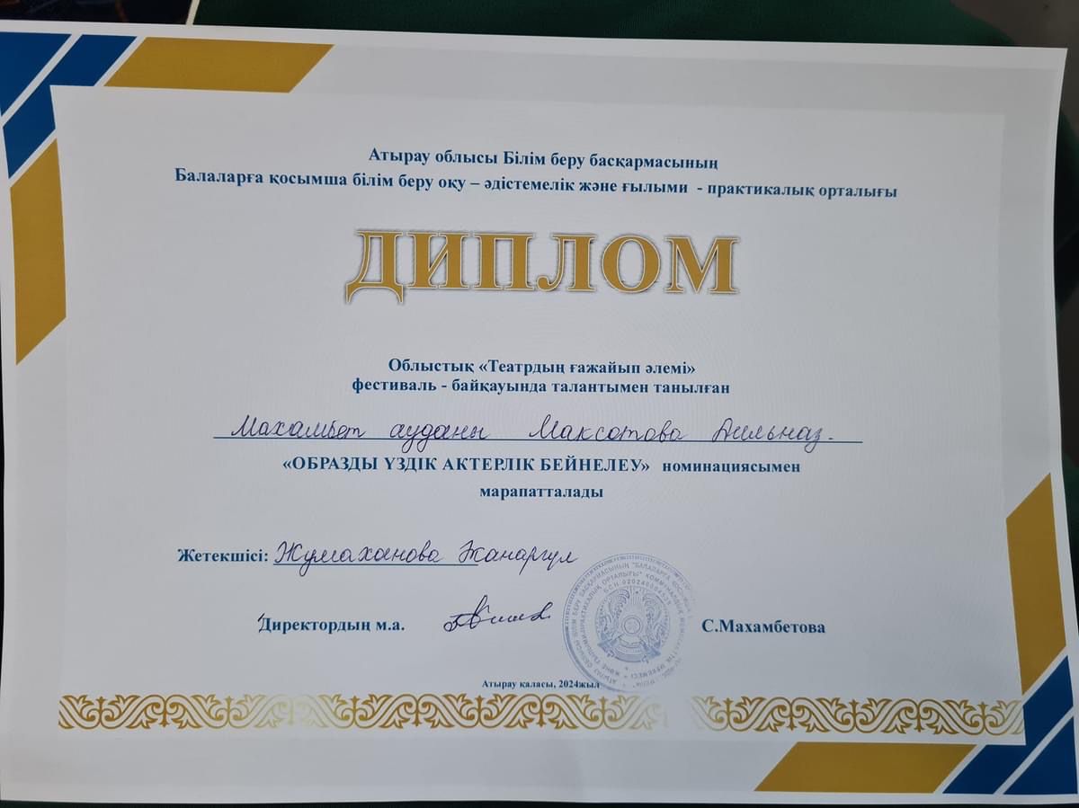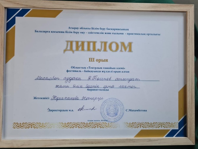 2024 жылдың 20 қыркүйек Дарынды балаларға арналған ұлттық гимназия базасында ұйымдастырылған облыстық «Театырдың ғажайып әлемі» атты театрландырылған қойылымдар байқауына «Мәңгілік бала бейнесі» пьесасы бойынша қатысқан Д.Төленов атындағы орта мектебінің оқушылары жүлделі 3орынды иеленді. Ал «Үздік актер» номинациясын 4 б сынып оқушысы Мақсотова Дильназ жеңіс алды.